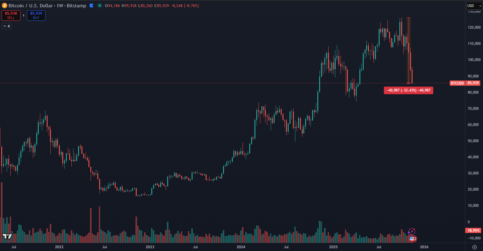 Bitcoin podľa údajov z TradingView opäť vzbudzuje pozornosť investorov, pretože sa nachádza v najstrmšej korekcii od júna 2022. Tentoraz nejde len o obyčajný výpredaj. Tempo poklesu je bez preháňania jedno z najdynamickejších, aké sa v tomto cykle objavilo.