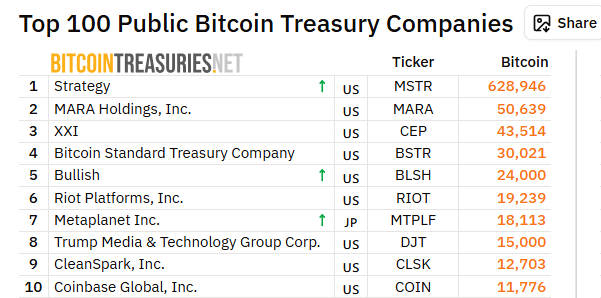 Okrem správcov aktív ako BlackRock či Fidelity existuje aj množstvo verejne obchodovaných spoločností, ktorých držby Bitcoinu sú transparentné. Podľa údajov Bitcoin Treasuries najviac vlastní Strategy so 628 946 BTC, nasleduje MARA Holding s 50 639 BTC, XXI s 43 514 BTC, Bitcoin Standard Treasury Company s 30 021 BTC a Bullish s 24 000 BTC.
