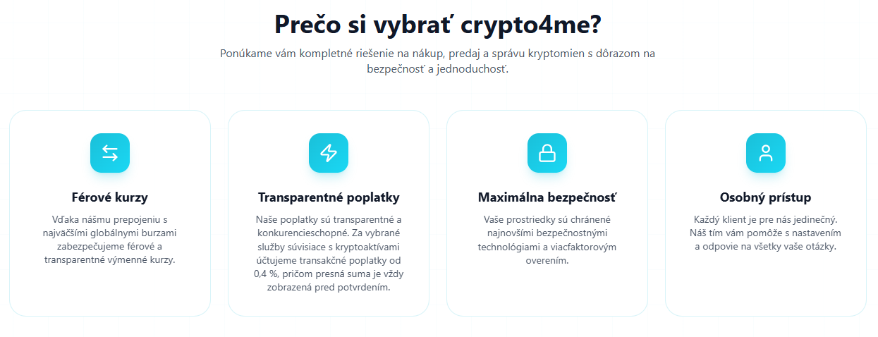 Pre bezpečný vstup do sveta kryptomien odporúčame spoločnosť crypto4me. Táto plne licencovaná platforma funguje pod dohľadom Národnej banky Slovenska a spĺňa prísnu európsku reguláciu MiCA, čím garantuje maximálnu ochranu vašich investícií.