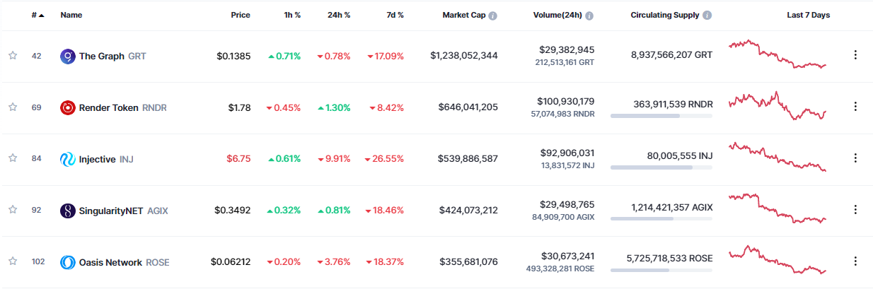 Už skôr sme vás informovali o kryptomenách umelej inteligencie, ktoré majú potenciál urobiť veľké zhodnotenia. Hovorili sme o The Graph (GRT), SingularityNET (AGIX), Render Token (RNDR), Oasis Network (ROSE) a Fetch.ai (FET). Všetky z nich ale dnes čelia dvojciferným stratám. Medzitým sa do top 5 AI kryptomien dostal aj Injective (INJ), o ktorom si viac môžete prečítať v článku Extrémne zisky tejto kryptomeny zatienili aj bitcoin.