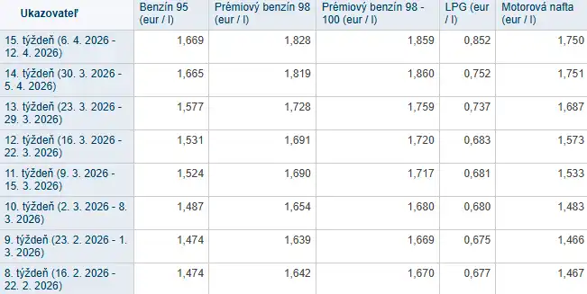 - Motorová nafta: Nafta zaznamenala ešte agresívnejšie zdražovanie. Z pôvodných 1,467 € (8. týždeň) vyskočila na 1,750 € (15. týždeň), čo predstavuje nárast o viac ako 28 centov (+19 %).