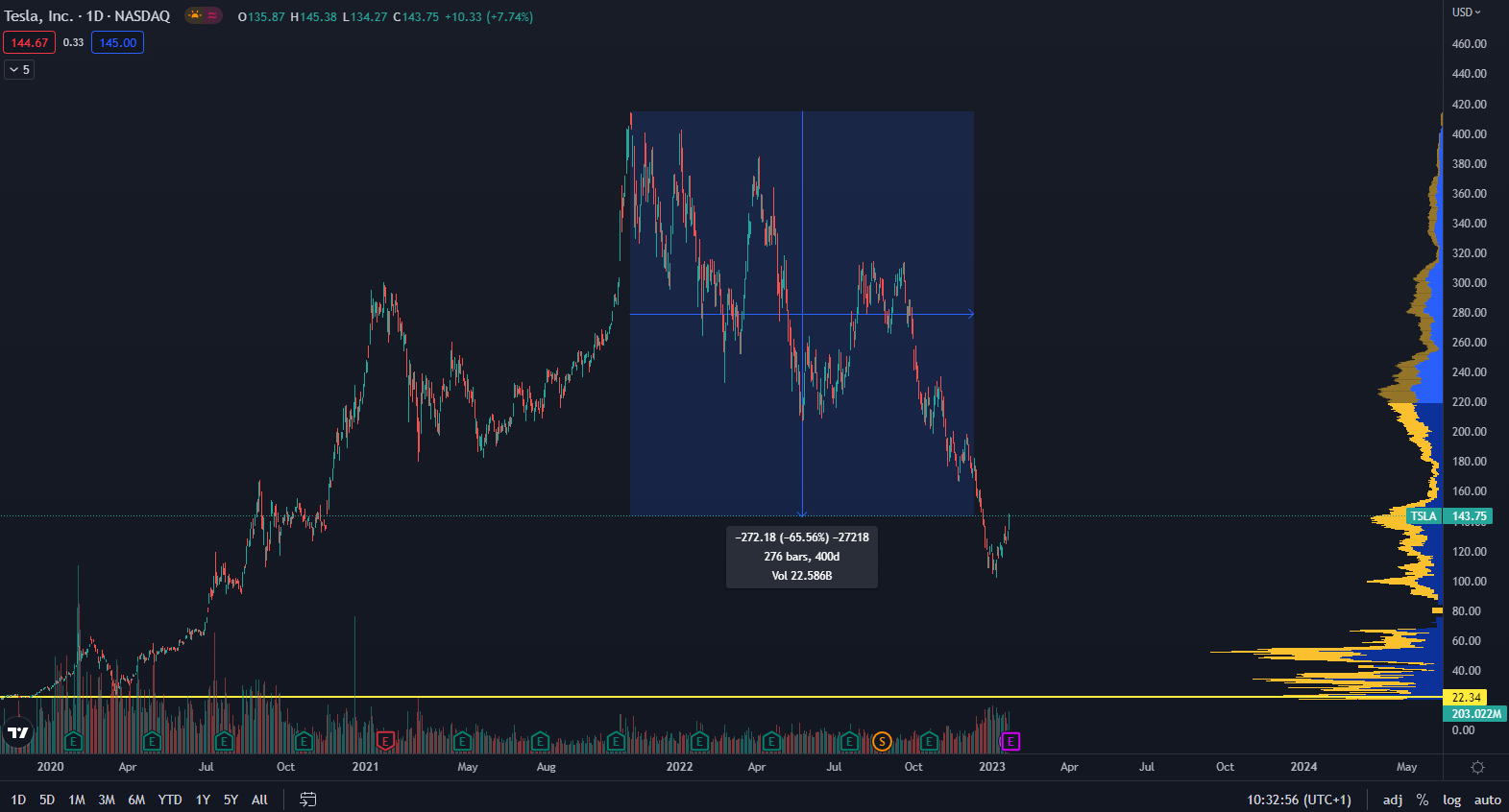Akcie TSLA sa nachádzajú o 65,50 % nižšie od svojho historického maxima. Pre porovnanie použijeme súčasný trend indexu Nasdaq, ktorý klesol „iba“ o 30 % v čase písania článku. Tesla v podstate čelí viac ako dvojnásobnému poklesu v porovnaní s technologickým indexom, ktorého je súčasťou.