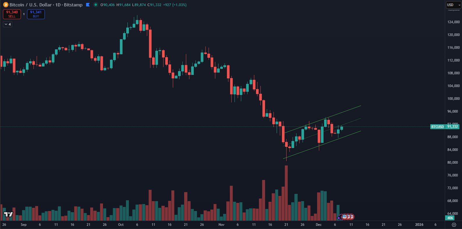 Technická analýza BTC naznačuje, že Bitcoin aj napriek nedávnemu prudkému poklesu stále zotrváva v rastúcom cenovom kanáli pripomínajúcom formáciu vlajky. Táto štruktúra poukazuje na pokračujúci trend, ktorý sa zatiaľ drží nad kľúčovými úrovňami podpory. Napriek tomu len čas ukáže, či sa tento rastúci kanál uzavrie smerom nahor, alebo dôjde k jeho prelomeniu.