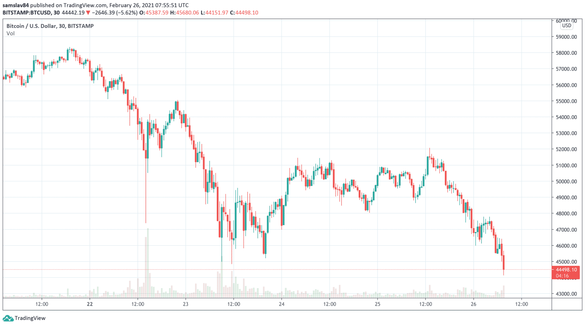 Zdá sa, že korekcia z prvých dvoch dní po menšej prestávke pokračuje. Bitcoin sa v čase písania tohto článku obchoduje na novom dne. Padol hlboko pod support na hladine 48 000 dolárov a aktuálne už testuje $44 000. Zdá sa, že optimizmus z posledných dvoch dní bol trochu predčasný.