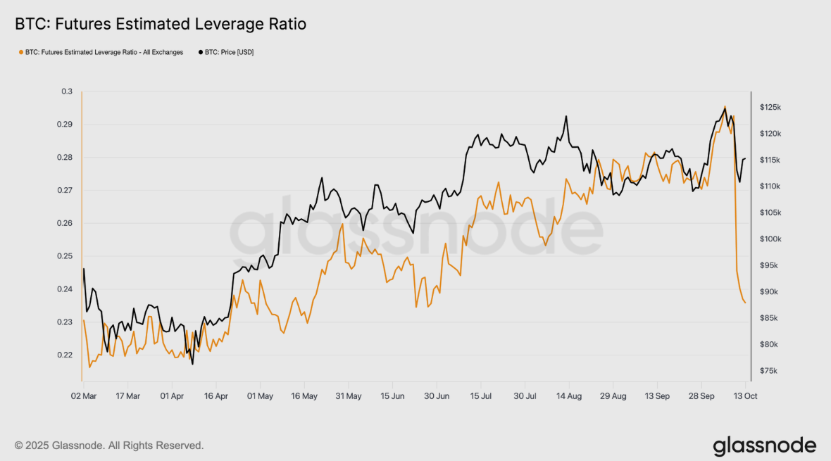 Po prudkom znížení otvorených pozícií futures sa metrika Estimated Leverage Ratio, teda pomer otvoreného záujmu k zostatkom na burzách, zrútil na viacmesačné minimá. Tento historický deleveraging vymazal nadmerné využitie pákového efektu naprieč systémom a predstavuje jeden z najväčších jednodňových resetov v histórii trhu.