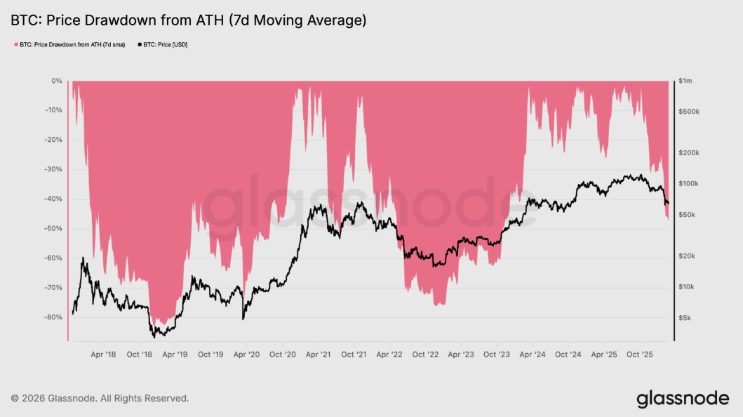 - Bitcoin čelí 47,3 % poklesu od ATH, čo historicky zvyšuje tlak na slabších investorov.