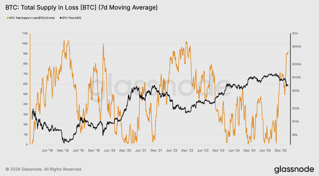 Dôležitý pohľad ponúka aj metrika Total Supply in Loss, ktorá sleduje objem mincí držaných pod aktuálnou spotovou cenou. Táto metrika dnes ukazuje približne 9,2 milióna BTC v strate, čo predstavuje takmer polovicu cirkulujúcej ponuky.