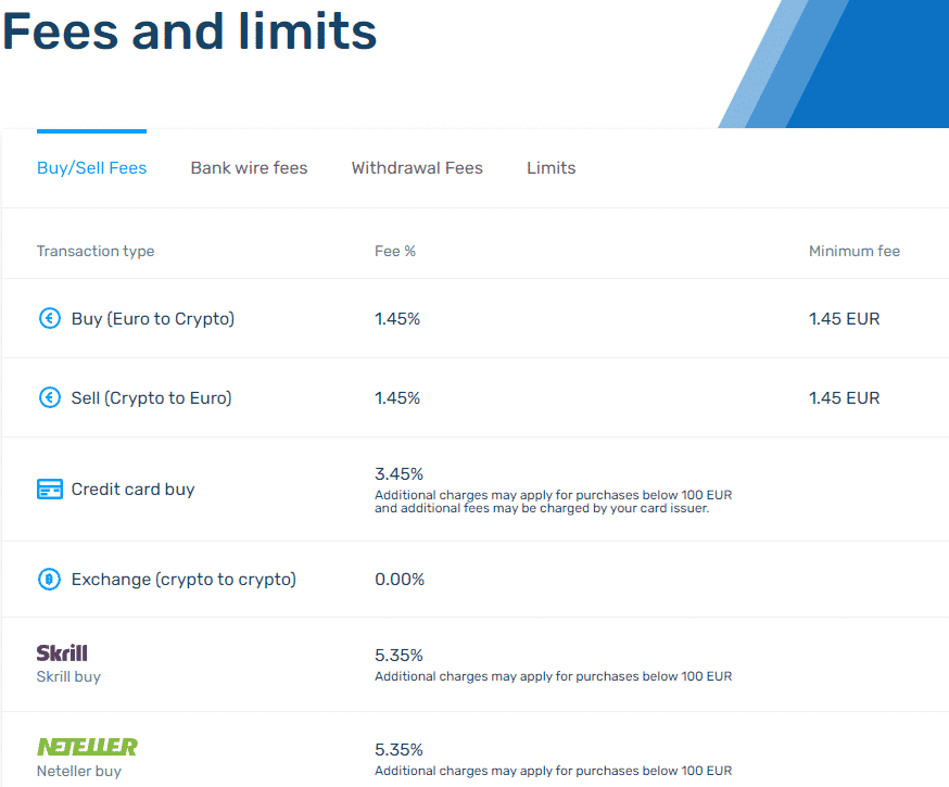 Poplatky za nákup a predaj kryptomeny cez fiat v rámci burzy – V prípade, že sa chystáte nakupovať kryptomenu prostredníctvom fiat meny, budete platiť poplatok 1,45 %, minimálne však 1,45 EUR. V prípade, že sa chystáte predávať kryptomenu späť do fiat meny, tak poplatok je rovnaký.