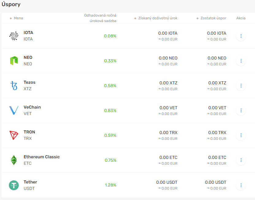 - Nakúpite danú kryptomenu alebo ju vložíte na účet. Zoznam kryptomien na sporenie je uvedený v záložke úspory.