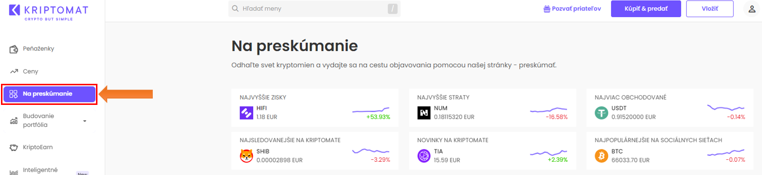 Predtým, ako zrealizujeme obchod, odporúčame nazrieť do sekcie Na preskúmanie. Táto časť slúži na celkový prehľad o trhu a nájdete tu informácie ako najziskovejšie a najstratovejšie kryptomeny, najviac obchodované a najsledovanejšie kryptomeny. Digitálne aktíva sú tu zoradené do rôznych zoznamov a sú rozčlenené aj podľa kategórií.