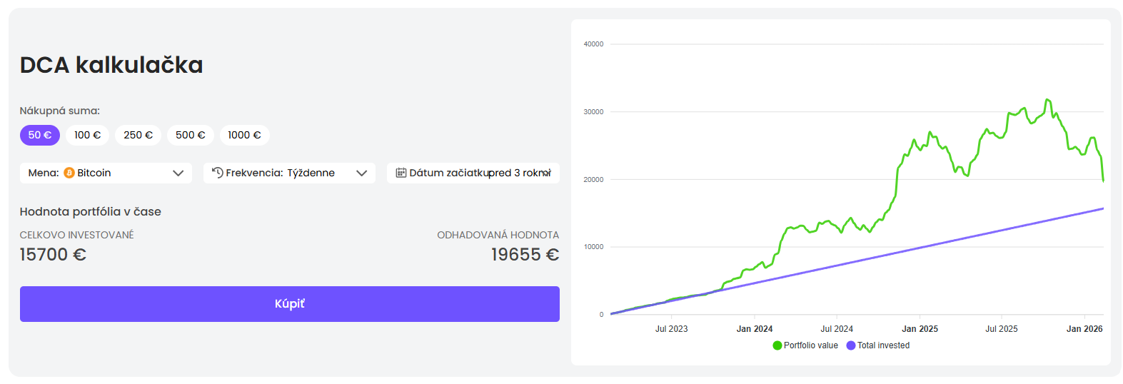 Hlavnou výhodou je automatizácia. Investor si zvolí kryptomenu, sumu a frekvenciu nákupu a systém následne realizuje transakcie automaticky. Platbu je možné nastaviť kartou alebo bankovým prevodom, pričom opakovaný nákup je možné kedykoľvek pozastaviť alebo zrušiť bez dodatočných nákladov.