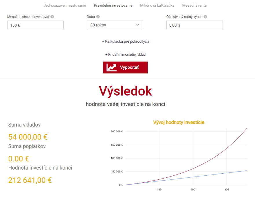 Pri kalkulácii predpokladáme ročný výnos 8 %. Tento výnos je odvodený od historického priemeru akciového indexu S&P 500, ktorý sa zhodnocoval cez 10 % ročne, pričom berieme do úvahy aj 2 % infláciu.