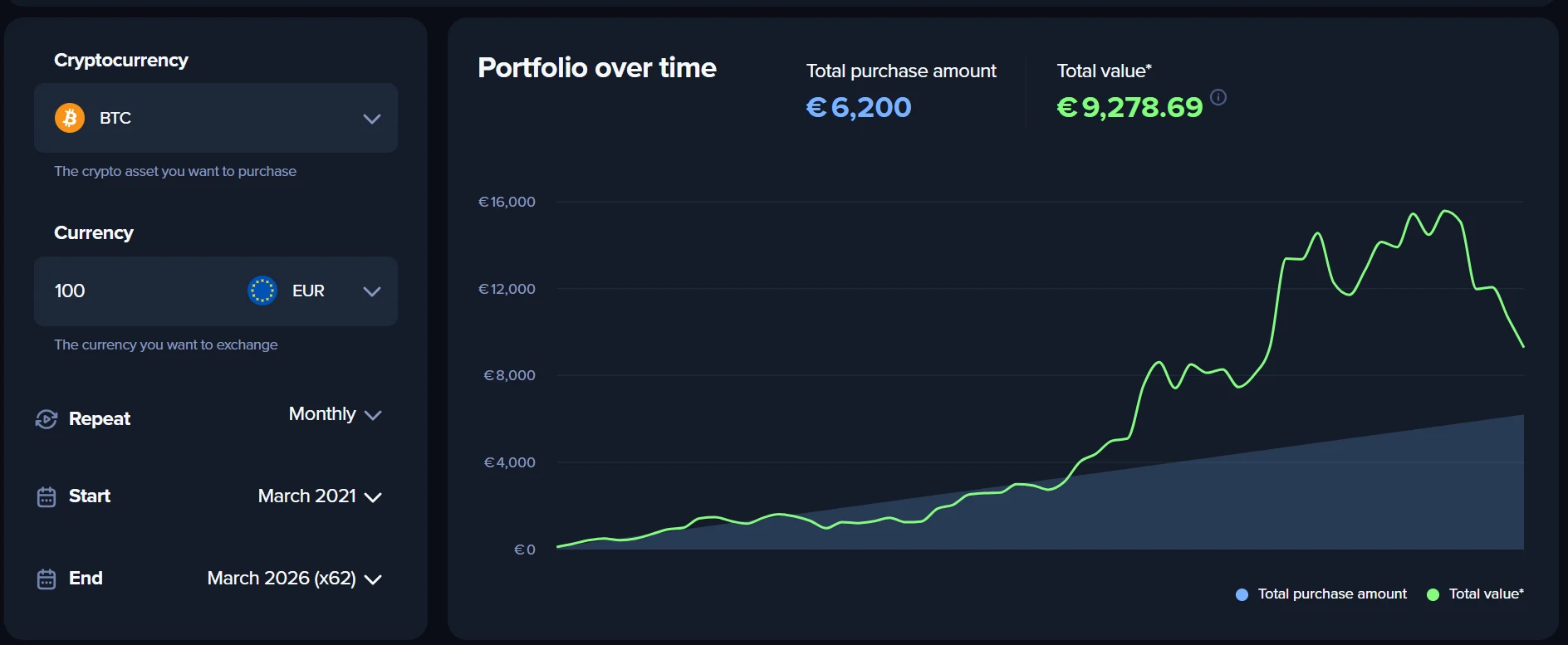 Bitcoin je pilier, ktorý definuje úspech v tomto segmente. Jeho dlhodobé investovanie by napríklad prinieslo za pravidelný vklad 100 € mesačne od roku 2016 zhodnotenie z celkového vkladu 12 200 € na úctyhodných 210 331 €. Tento príklad jasne ukazuje, ako čas a vytrvalosť pracujú v prospech investora.