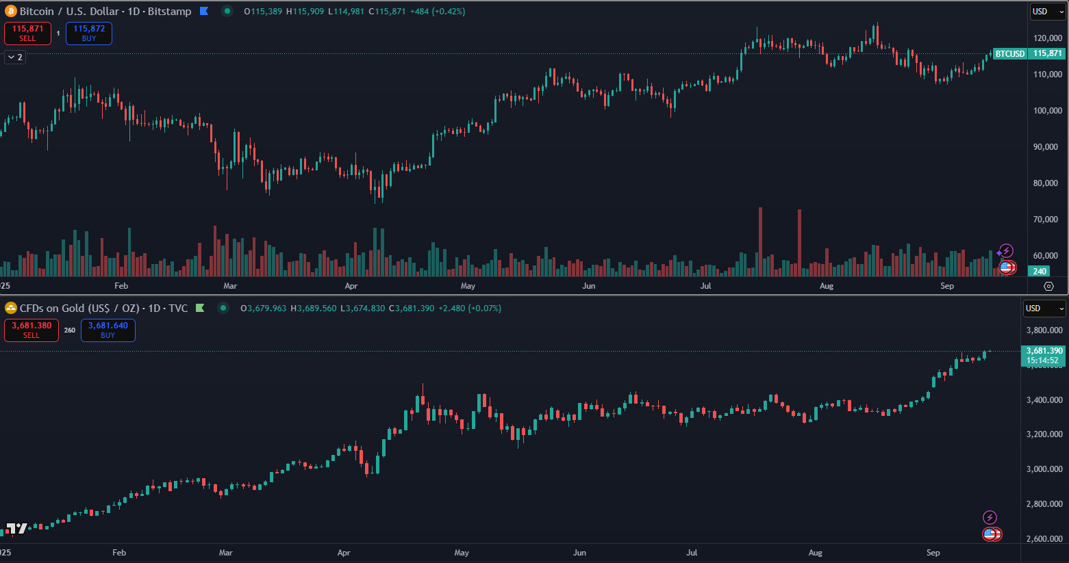 BTC zostáva úzko prepojený so zlatom, ktoré 12. septembra prekročilo hranicu 3 650 dolárov za uncu, zatiaľ čo striebro dosiahlo najvyššie uzatváracie ceny za 14 rokov. Historicky korelácia naznačuje, že rast cien zlata často predchádza významným bitcoinovým vzostupom.