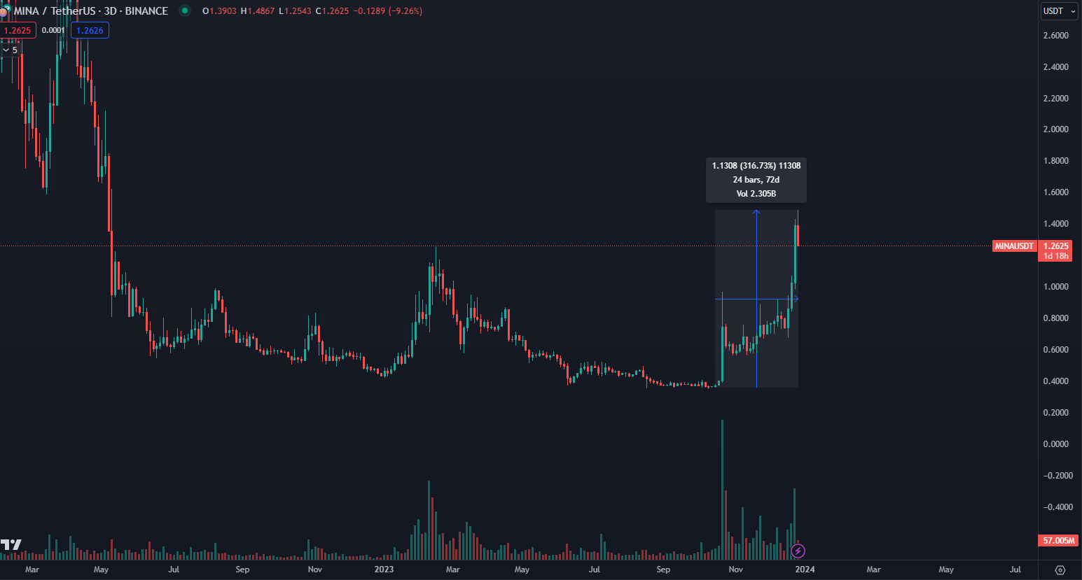 MINA stúpla len za 70 dní o vyše 315 %. Už 24. októbra vystrelili obchodné objemy do rekordných úrovni a naštartoval sa rast. Odvtedy sú síce nákupy na ústupe, no stále sme svedkami vysokého obchodného záujmu. Podľa údajov TradingView sa teraz MINA obchoduje na trhovej cene 1,26 dolára zatiaľ čo v polovici októbra to bolo len približne 0,35 dolára.