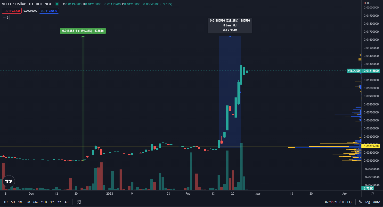 Velo bolo uvedené na trh v septembri 2020 a uvádzacia cena bola stanovená na 0,50 dolára. Ako vidíme podľa údajov z TradingView, trhová cena kryptomeny v čase písania článku dosahuje úroveň 0,012 dolára. Na jeseň 2021 sa cena dokonca vyšplhala nad 1 dolár a odvtedy neustále klesá.