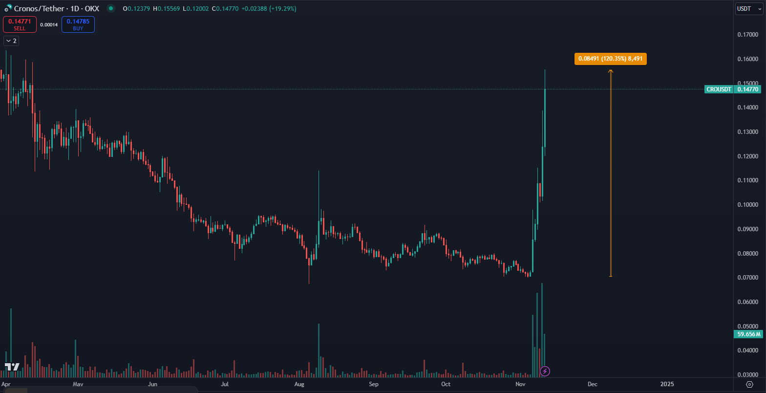 Ako vidíme podľa TradingView, trhová cena CRO zaznamenala prvý rast od marca 2024. Tento vzostup bol dokonca rýchlejší ako na prelome marca a februára, kedy došlo za týždeň k nárastu o 100 %. Zároveň sa zvýšil aj objem obchodovania, čo podčiarkuje dôležitosť nárastu ceny.