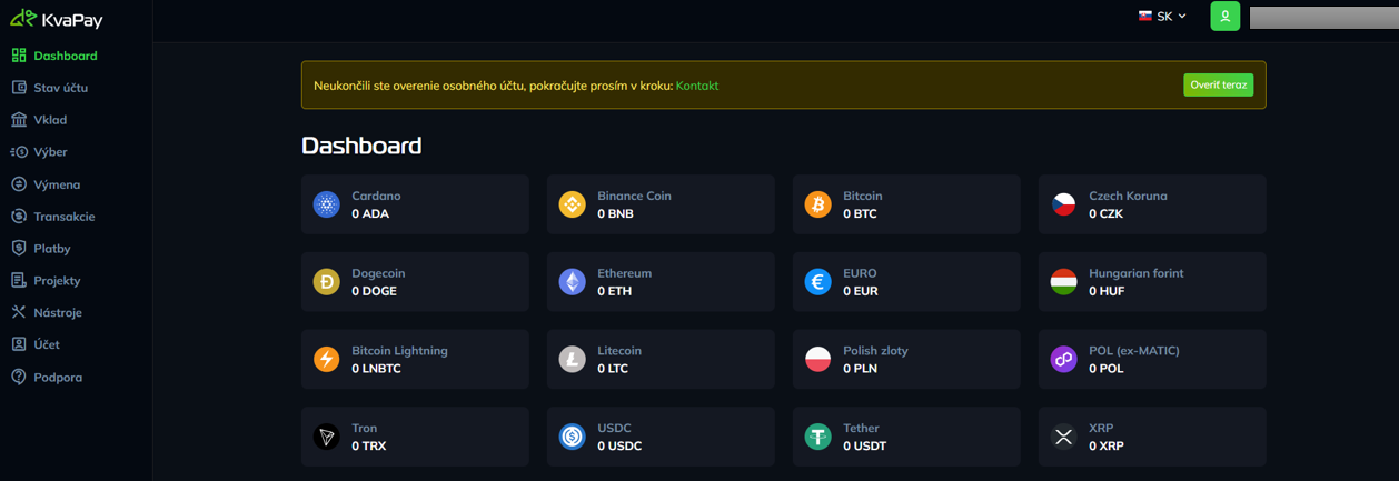 Táto sekcia je kľúčová pre všetkých, ktorí aktívne obchodujú, investujú alebo potrebujú flexibilitu pri správe svojich kryptomien. KvaPay ponúka intuitívne rozhranie, ktoré obsahuje: