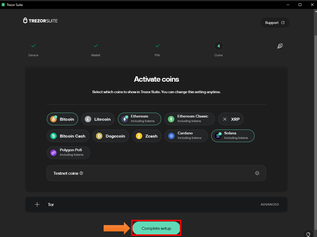 Po úspešnom nastavení PIN-u vás aplikácia vyzve, aby ste si zvolili, ktoré kryptomeny chcete vidieť zobrazené v Trezore. Tento výber si môžete kedykoľvek zmeniť. Stačí kliknúť na Complete setup.