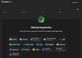 Po úspešnom nastavení PIN-u vás aplikácia vyzve, aby ste si zvolili, ktoré kryptomeny chcete vidieť zobrazené v Trezore. Tento výber si môžete kedykoľvek zmeniť. Následne vás už aplikácie pustí do samotného rozhrania.