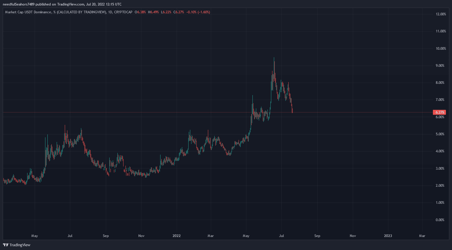 Keď 19. júna dosiahol Bitcoin minimum na cene 17 600, dosiahla dominancia stablecoinu USDT maximum na 9,47 %. Keď sa pozrieme na graf nižšie, môžeme vidieť, že v súčasnosti je dominancia v korekcii a smeruje k supportu v zóne okolo 6,4 až 5,7 %. Tu je potrebné sledovať, aký scenár nastane. Pokiaľ by sa dominancia prepadla, možno rátať s pokračovaním rastu Bitcoinu a altcoinov. Ak však nastane odraz, rast Bitcoinu sa zastaví.