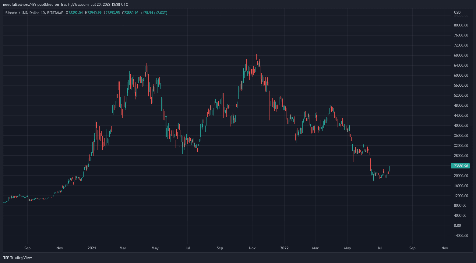 Trh s kryptomenami zažíva v posledných dňoch mierne oživenie. Zelené čísla na grafoch prichádzajú po krutých prepadoch, ktoré znížili celkovú kapitalizáciu celého sektoru z 2,2 bilióna v roku 2021 na 1 bilión v súčasnosti. V čase písania článku sa vlajková kryptomena Bitcoin obchoduje za 23 720 a je to už tretí deň, čo neprestajne rastie. Od svojho posledného minima na cene 17 600 narástla kryptomena o vyše 30 % a druhá najväčšia kryptomena Ethereum o vyše 80 %.