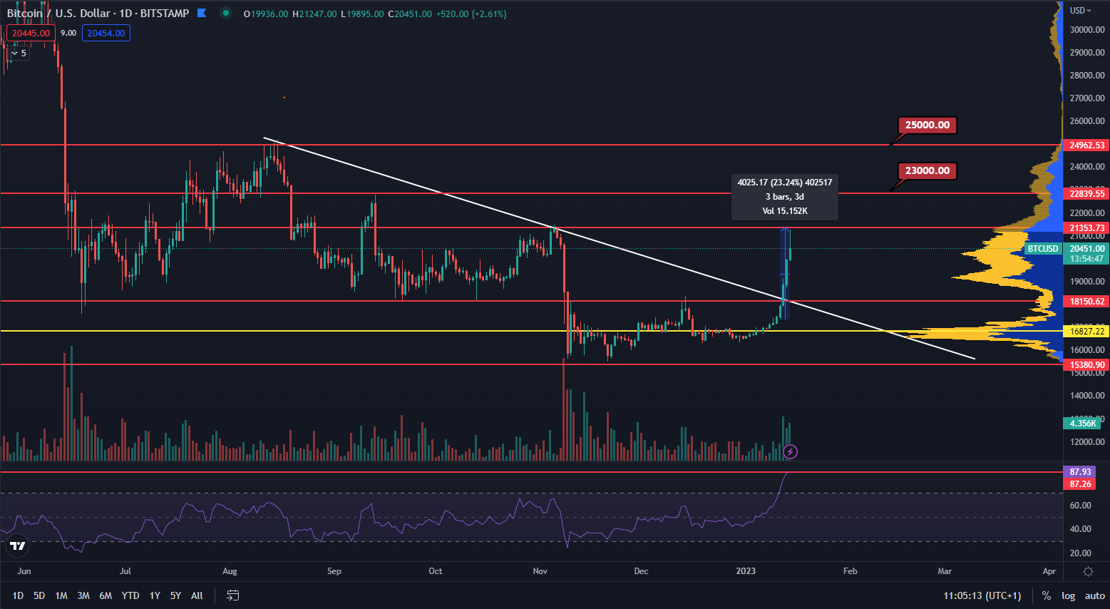 Vysoká prekúpenosť podľa RSI ale nehovorí o tom, že bullish trend skončil. Rast môže pokojne pokračovať aj naďalej, no z krátkodobého hľadiska je trh prehriaty a cena potrebuje vytvoriť lokálne maximum. V prípade, že sa zaujímate o dlhodobú analýzu Bitcoinu na rok 2023, môžete si prečítať článok Ako môže vyzerať vývoj ceny Bitcoinu v roku 2023? Toto sú najpravdepodobnejšie scenáre.