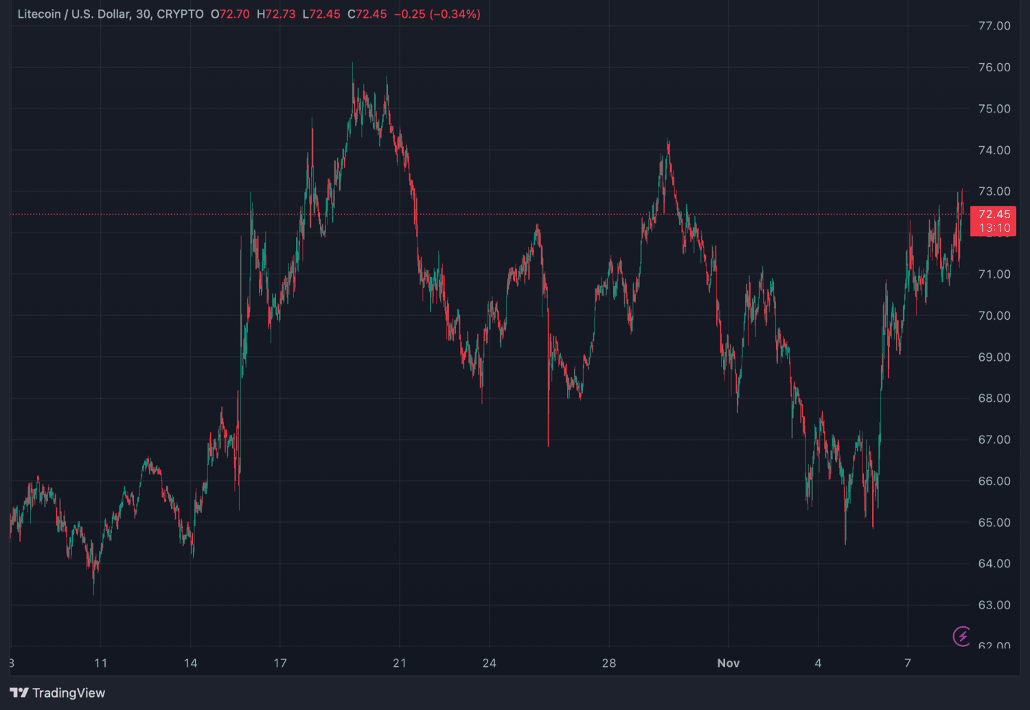 Litecoin vykazuje sľubné býčie signály, obchoduje sa medzi 63 a 72 dolármi s nedávnym pohybom nahor – približne 3 % za posledný týždeň a 8 % za posledný mesiac.