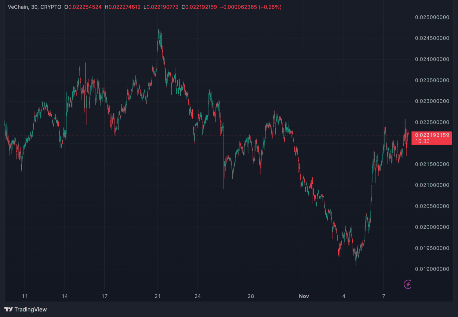 VeChain sa obchoduje v úzkom cenovom pásme, vykazujúc známky konsolidácie po nedávnych poklesoch. Kryptomena bola v poklesovej fáze s výrazným poklesom za posledných šesť mesiacov.
