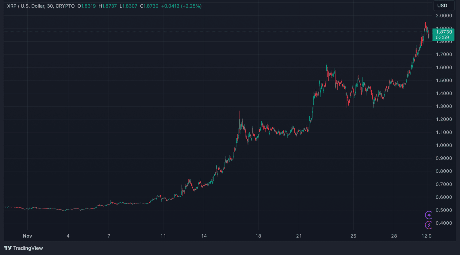 Cena XRP sa niekoľko rokov snažila prekonať úroveň odporu 1 dolár. Právny spor XRP s SEC kedysi vrhol tieň, ktorý XRP sťažoval zotavenie. Od zvolenia Trumpa do úradu však kryptotrh zachvátil býčí sentiment. XRP konečne rastie s výrazným nárastom ceny o viac ako 180 % za posledný mesiac.