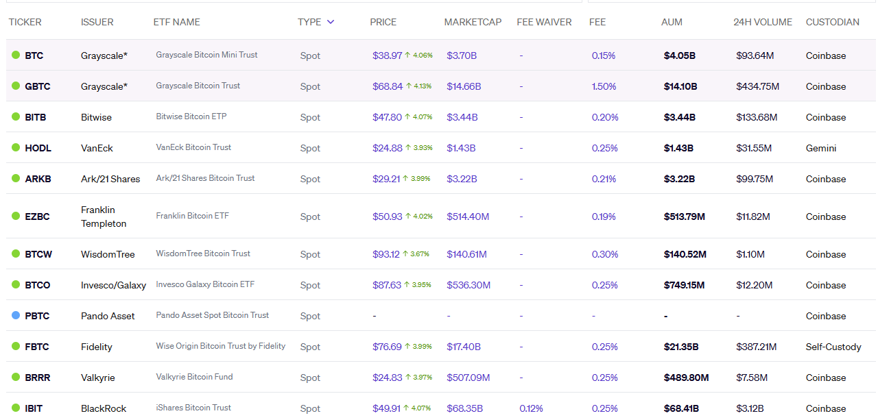 Zoznam spotových ETF. Zdroj: blockworks.com