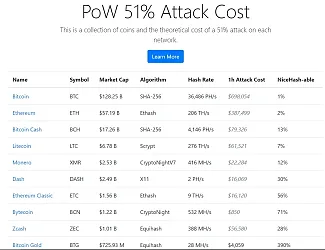 1h Attack Cost (cena za jednu hodinu trvajúci útok) – tento údaj uvádza sumu potrebnú na získanie 51% hash rate po dobu jednej hodiny. Výpočet vychádza z cien služby NiceHash. Ide o slovinskú spoločnosť zaoberajúcu sa cloud miningom. V prípade Bitcoinu táto suma činí viac ako pol milióna dolárov.