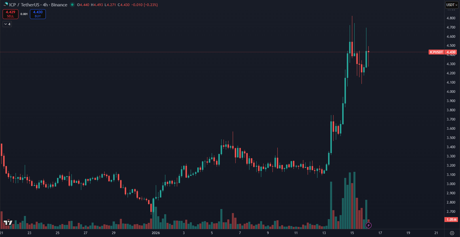Podľa údajov magazínu TradingView cena kryptomeny ICP prudko rástla. Len za dva dni vyskočila z 3,11 dolára na 4,82 dolára, čo signalizovalo silný nákupný tlak. Potom však trh vybral časť ziskov a cena sa ustálila na približne 4,43 dolára, keď investori prehodnocovali krátkodobé riziká aj ďalší potenciál rastu.
