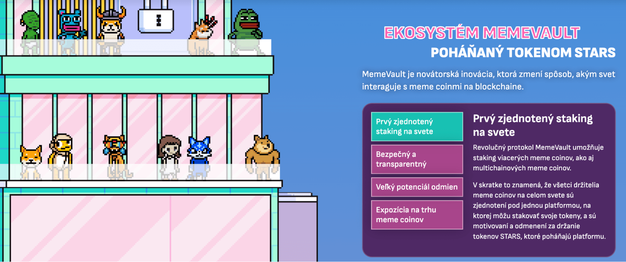 MemeVault tiež disponuje systémom odmeňovania za staking natívnych tokenov STARS. To znamená, že čím viac STARS do MemeVaultu vložíte, tým vyššie výnosy získate.