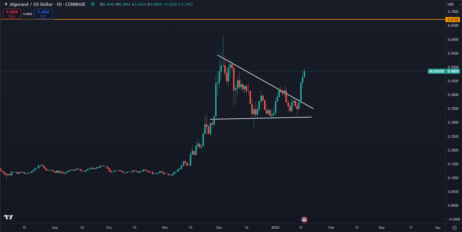 Kryptomena ALGO sformovala typické prerazenie rezistencie. Po tom, čo v závere roka došlo k zhodnoteniu o takmer 500 % za jediný mesiac, nastalo obdobie vychladnutia, no zároveň sa sformoval trojuholník, ktorý naznačoval, že skôr či neskôr nastane ďalšia rastúca vlna.