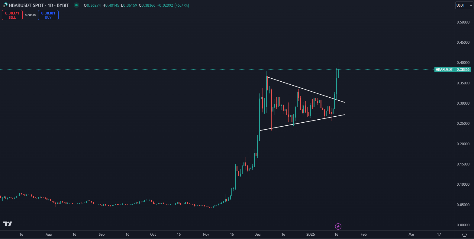 Medzi ďalšie najziskovejšie kryptomeny s vysokou kapitalizáciou za posledný týždeň zaraďujeme aj HBAR. Kryptomena dokázala v závere roka za jediný mesiac stúpnuť o neuveriteľných 800 %. Následne sa znovu sformoval trojuholník a pred 3 dňami sme boli svedkami počiatku novej rastúcej vlny.