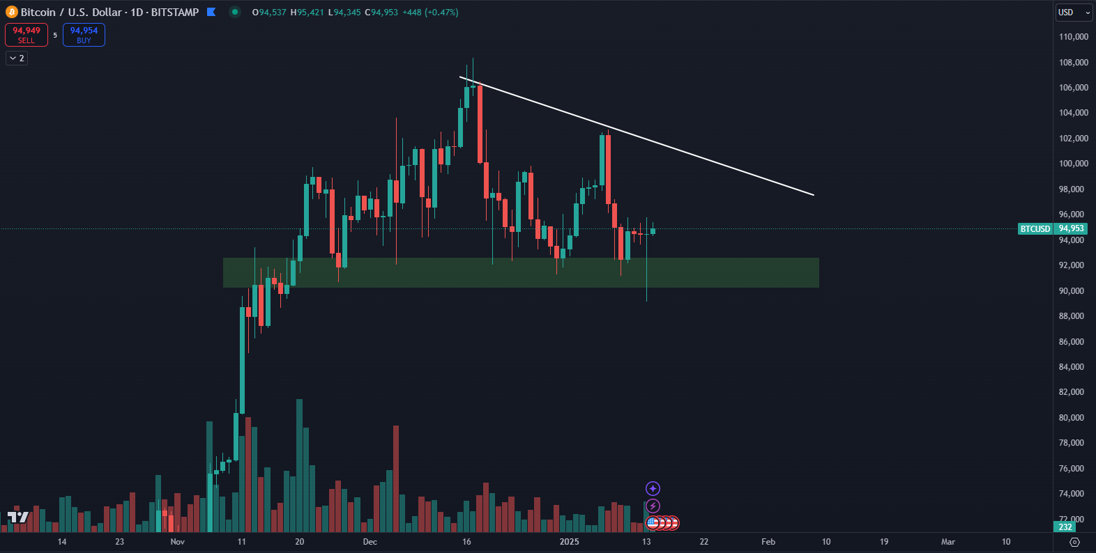 Cena Bitcoinu včera, 13. januára, zaznamenala prepad až na 89 164 dolárov, čo je najnižšie zaznamenaná hodnota za posledné 2 mesiace. Hneď na to sa ale Bitcoin odrazil späť nad 95 000 dolárov, kde sa v čase písania obchoduje. Takže z krátkodobého hľadiska bol support neporušený.