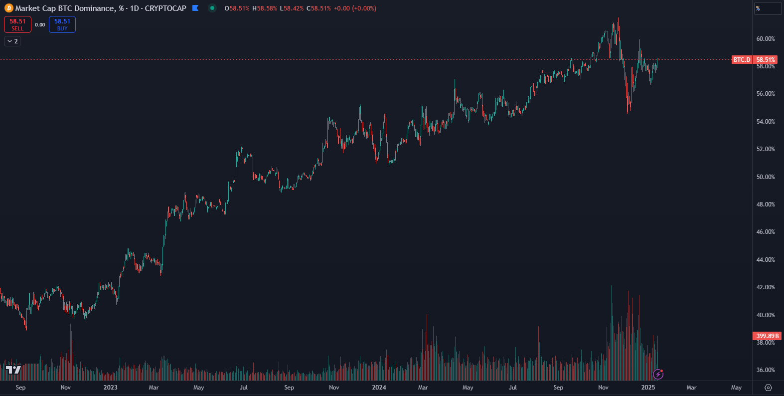 Výsledkom tejto situácie na trhu je rast bitcoinovej dominancie. Vzostup jasne dominuje už od novembra 2022. Mierne zastavenie nastalo len nedávno v závere roka 2024, no dlho tento trend netrval, keďže dominancia BTC opäť rastie.