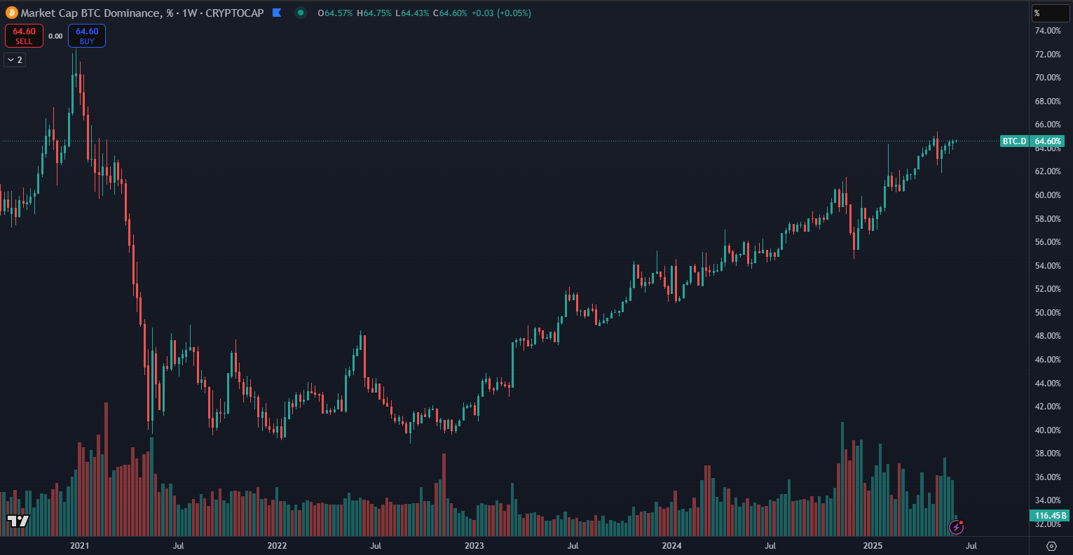 Výsledkom tohto fenoménu je neustále rastúca dominancia Bitcoinu na trhu s kryptomenami. Aj keď došlo k miernemu poklesu dominancie začiatkom mája, teraz opäť rastie a momentálne sa pohybuje na úrovni približne 64,60 %, čo je hodnota, ktorú sme naposledy videli ešte vo februári 2021.