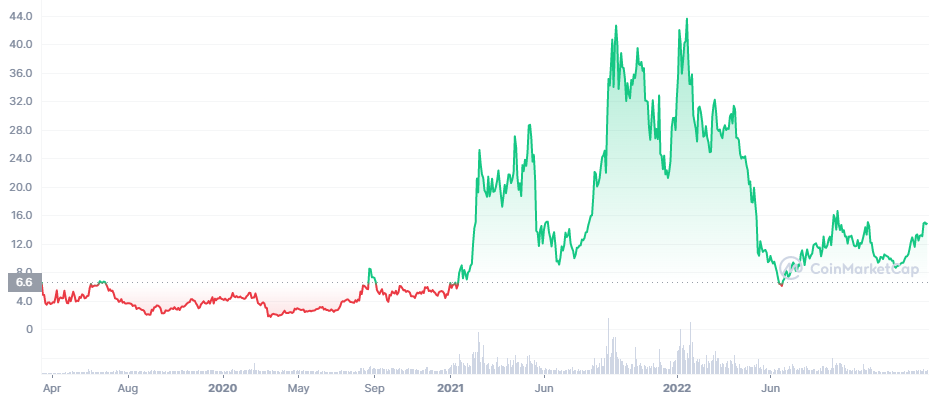 Cena jednej z najznámejších kryptomien bola posledný rok aj napriek nepriaznivej situácií na trhu pomerne stabilná. Aktuálne sa nachádza na 14 dolároch a od konca minulého roka je už v 100 % zisku.