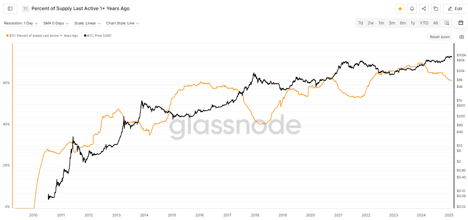 Už sme si povedali, že vrchol cyklu sa blíži. Poďme si túto hypotézu podložiť onchain metrikou. Percento cirkulujúcej ponuky, ktorá sa nepohla aspoň 1 rok naznačuje, že vrchol cyklu je za dverami. Všimnite si, že metrika klesá v období rastu ceny a naopak. Zároveň môžeme pozorovať mierne oneskorenie v reakcii metriky vo vzťahu k cene.