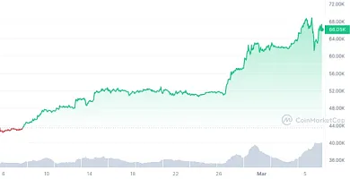 Prudký progres v podobnom tempe môžeme pozorovať aj dnes. Od 6. februára, keď sa Bitcoin pohyboval okolo 43 200 dolárov, vzrástol na momentálnu hladinu nad 66-tisíc dolárov, čo je skok o 55 %. Historických hodnôt pritom dosahuje viac než mesiac pred halvingom odmien za ťažbu Bitcoinu.