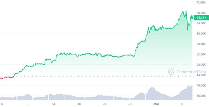 Prudký progres v podobnom tempe môžeme pozorovať aj dnes. Od 6. februára, keď sa Bitcoin pohyboval okolo 43 200 dolárov, vzrástol na momentálnu hladinu nad 66-tisíc dolárov, čo je skok o 55 %. Historických hodnôt pritom dosahuje viac než mesiac pred halvingom odmien za ťažbu Bitcoinu.