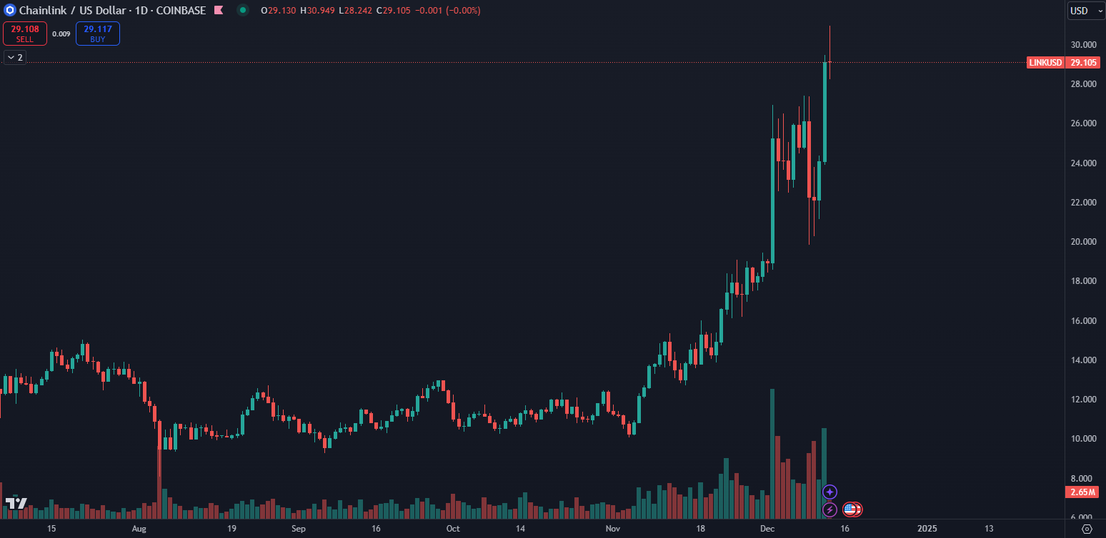 Kryptomeny sa pravdepodobne pripravujú na ďalší krátkodobý vzostup. Uprostred toho, ako sa Bitcoin opäť dostal na hranicu 100 000 dolárov, mnohé altcoiny čelili korekcii. V tomto článku sa pozrieme na Chanlink (LINK), ktorý sa stal najziskovejšou kryptomenou v rebríčku top 100 vďaka masívnemu zhodnoteniu, ukazujú údaje TradingView.
