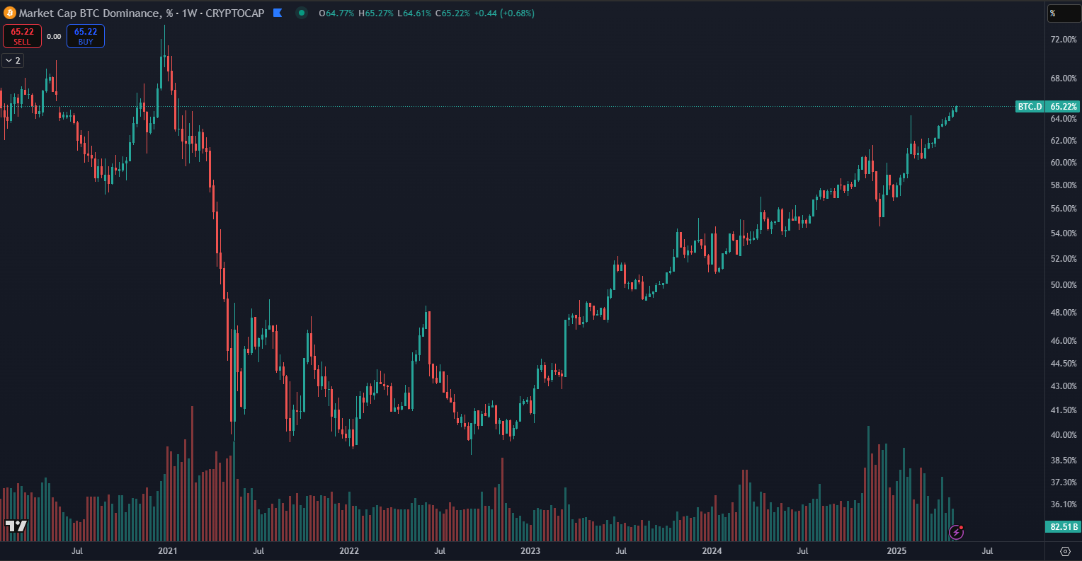 Dominancia Bitcoinu prekonala 65 %. Zdroj: tradingview.com