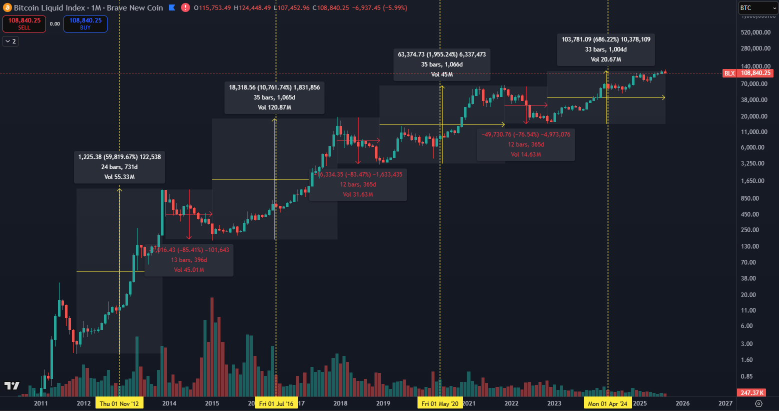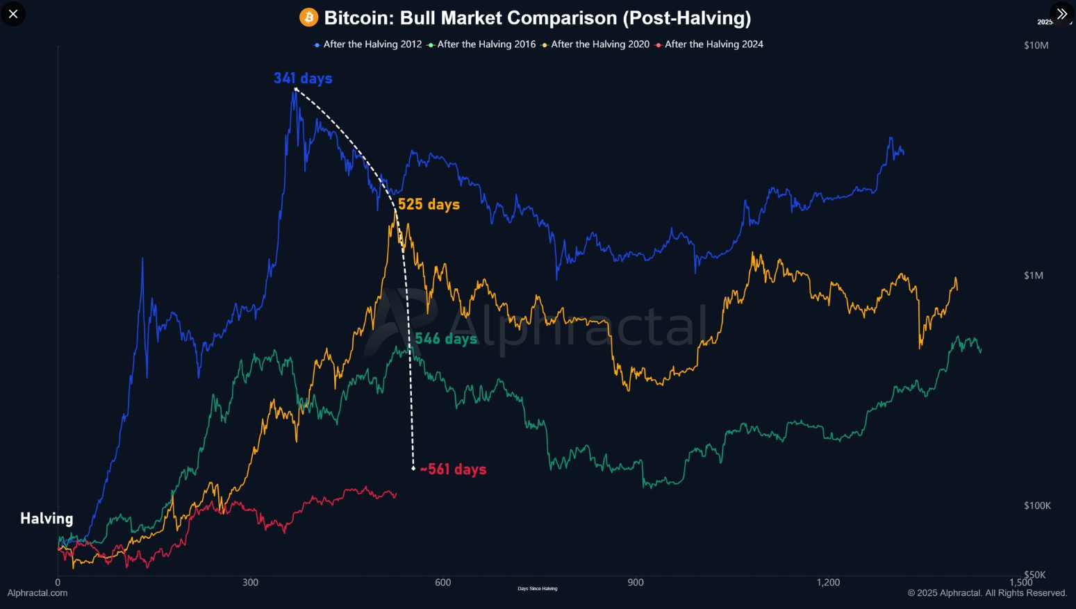 Po období masívneho rastu trh zvyčajne vytvára lokálne maximum. Podľa historických údajov a porovnávania predchádzajúcich cyklov by sa toto maximum malo objaviť na jeseň tohto roku. Ak Bitcoin do konca roka nedosiahne nové maximum, znamenalo by to, že trh sa odchyľuje od zaužívanej cyklickosti.