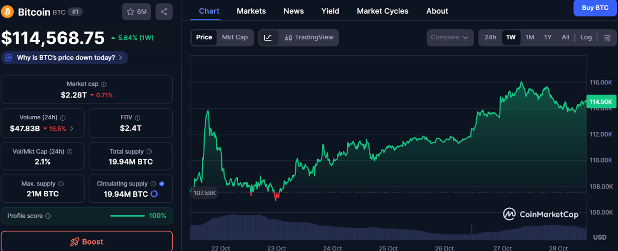 Po vyše dvoch týždňoch poklesu cien kryptomien opäť ožíva optimizmus na kryptotrhu. Cena Bitcoinu momentálne dosahuje 114 570 $, čo predstavuje rast až o 5,6 % za posledný týždeň. Bitcoin sa tak nachádza už len 9,3 % pod svojím all-time high zo začiatku tohto mesiaca.