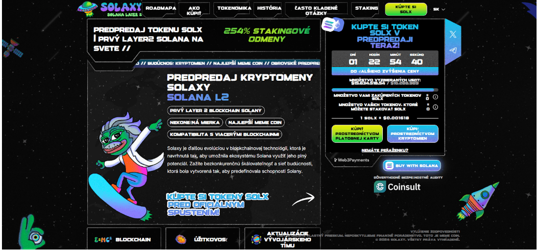 Bezpečnosť a dôveryhodnosť projektu Solaxy posilňuje audit smart kontraktu, ktorý vykonala spoločnosť Coinsult. Tokeny Solaxy si môžete v rámci predpredaja uzamknúť a získať atraktívne stakingové odmeny vo výške 254 % p.a.