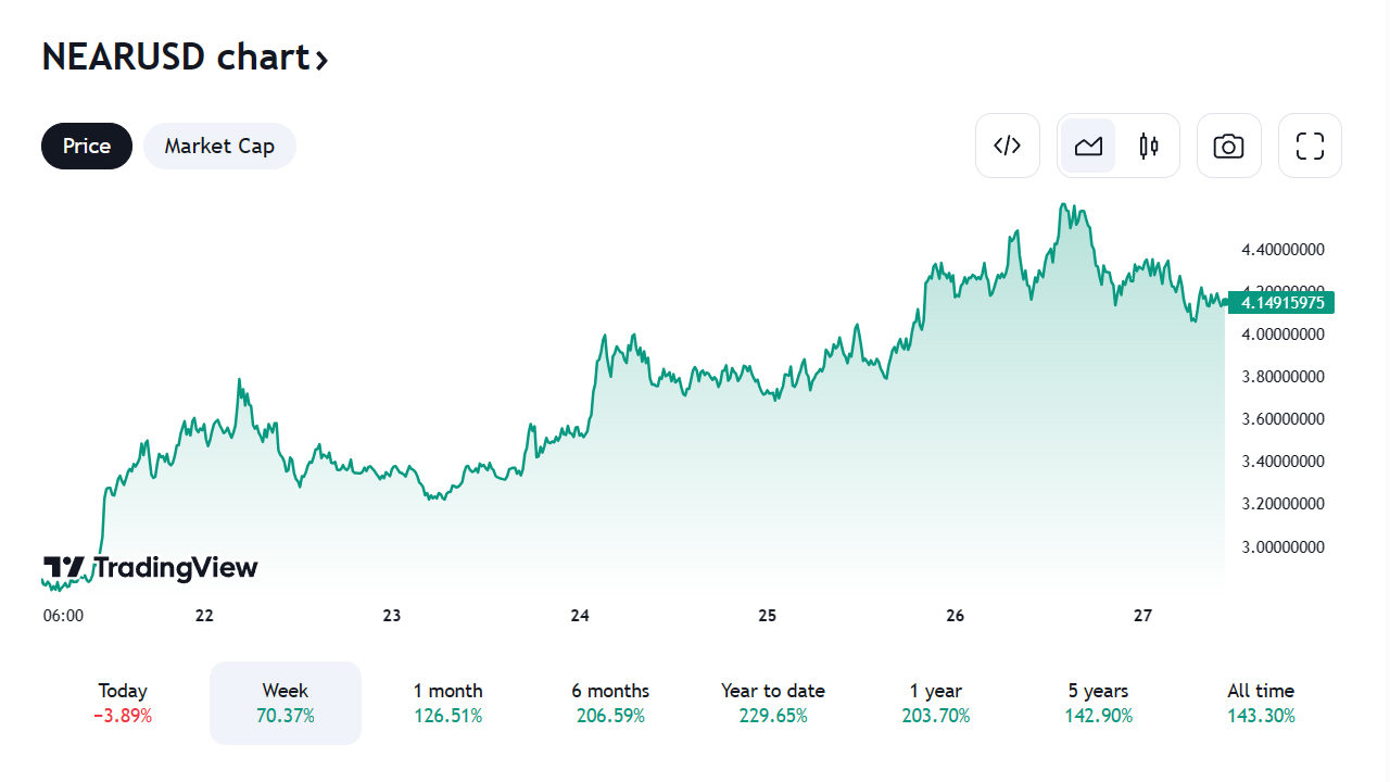 Near Protocol zaznamenal výrazný nárast ceny, pričom za posledné štyri dni vzrástol o 65 %, čo viedlo k 440-dňovému maximu, čo naznačuje silný rastový trend. Cenová akcia a hodnoty RSI naznačujú, že trend pre Near Protocol zostáva pozitívny s potenciálom ďalšieho rastu.