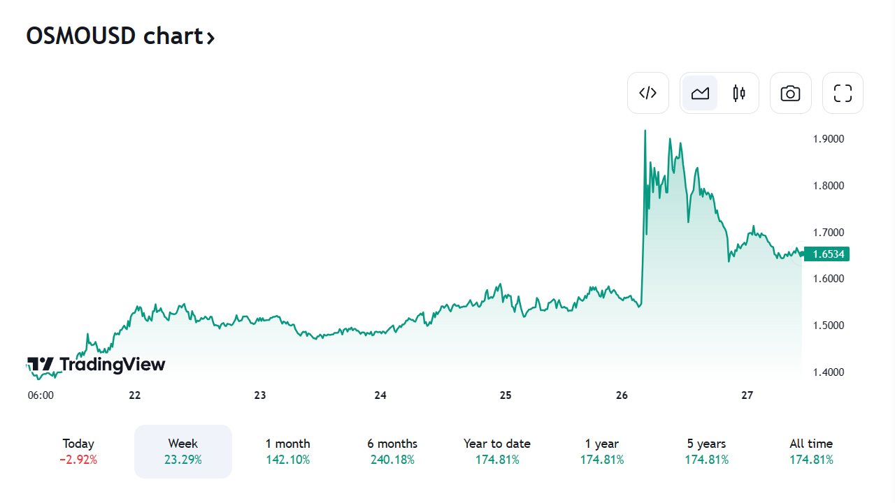 Zvýšený objem obchodovania a aktivita siete pozitívne ovplyvnili dynamiku ceny OSMO. Mechanizmy zachytávania hodnoty, ako sú poplatky za prijímanie a poplatky za transakcie, prispeli k prirodzenej hodnote, keďže sa zvýšil objem obchodovania. Nedávne zisky a nárast objemu naznačujú rastúci záujem a aktívnu účasť na trhu.